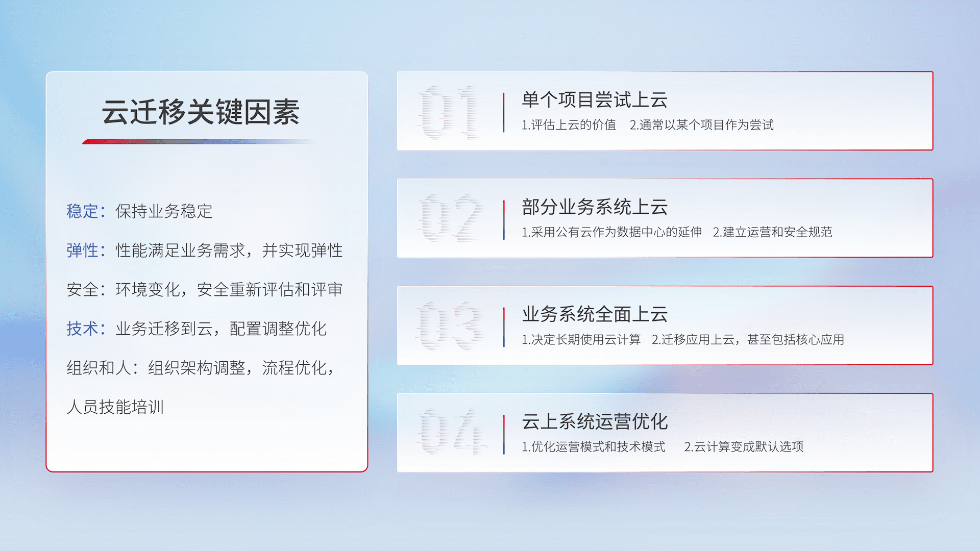 结合实际业务,,,从规划设计、、云平台选型、、、云原生改造、、、、数据迁移、、、集成交付,,,,迁移全过程为客户识别最佳上云路径,,做好风险识别管理,,,设计网络架构、、、身份权限、、、、安全审计合规、、操作审计、、、日志审计、、、、监控告警策略、、多站点容灾设计等,,,对云上基础设施进行整体规划,,提升IT治理水平,,,以满足弹性、、、、高可用、、、高性能的需求。。